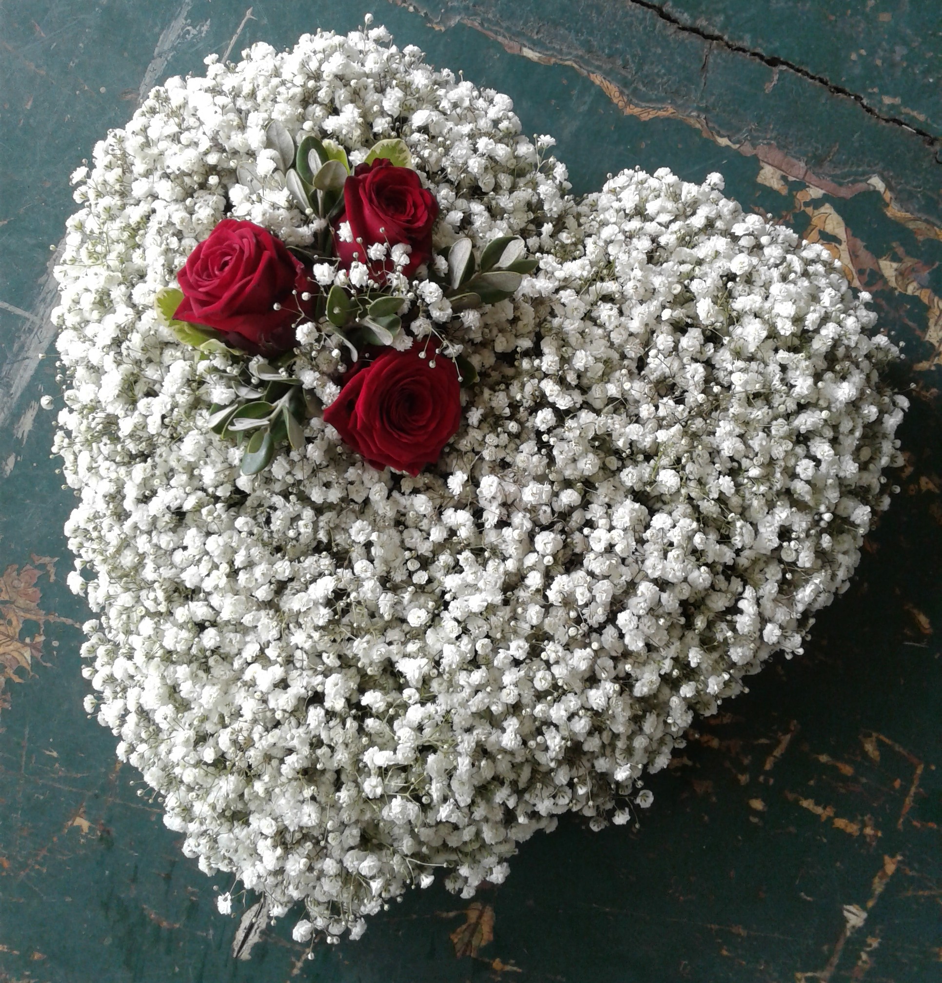 Gypsophila Heart with Rose Cluster A timeless floral tribute made with love and care.